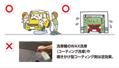 汚れがしみ込まず、汚れが付きにくくなります。洗車の回数もグッと減り、たまの洗車も非常に楽になります。お手入れは手洗い洗車、もしくは洗車機(スポンジブラシのみ)でも構いません。水洗い洗車、またはシャンプー洗車でお願いします。(ワックス洗車など、噴きかけのコーティング剤は控えてください。)